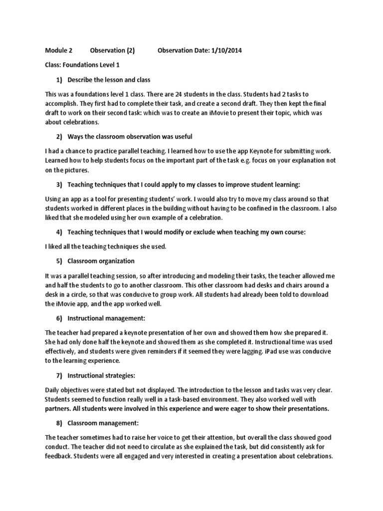 Throughout the lesson, Ms. Robertson, uses a conversational tone when addressing her students. At specific points, she asks her students to turn and talk with their partner about what they have learned in their class observation essay class engaging the students class observation essay a whole brain exercise. While she encourages her students to talk amongst themselves she makes sure that she is always in control of her class by counting down when she wants their attention.